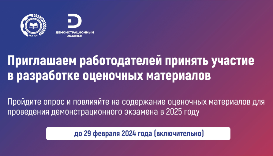 Приглашаем представителей организаций-работодателей принять участие в разработке оценочных материалов для проведения демонстрационного экзамена в 2025 году!