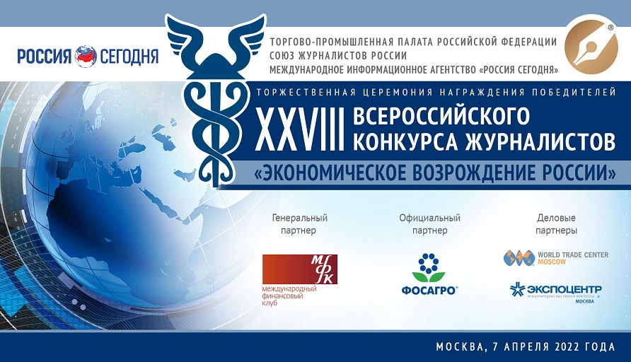 Торжественная церемония подведения итогов и награждения победителей конкурса журналистов «Экономическое возрождение России» пока планируется на 7 апреля 2022 года в МИА «Россия сегодня» на Зубовском бульваре, д. 4.