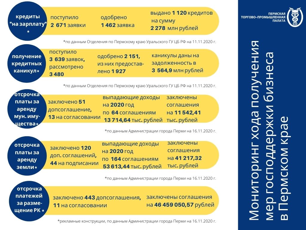 На этой неделе были получены обновленные данные по кредитной поддержке бизнеса от Отделения по Пермскому краю Уральского ГУ ЦБ РФ на 11 ноября 2020 года и цифры по муниципальной поддержке от Администрации города Перми на 16 ноября 2020 года.
