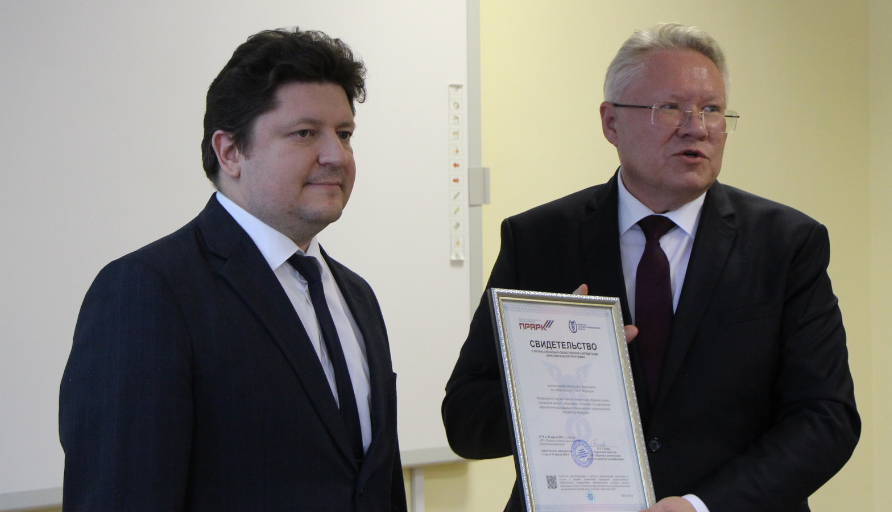 Президент Пермской ТПП Вячеслав Белов вручил Свидетельство о профессионально-общественной аккредитации образовательной программы среднего профессионального образования по специальности 33.02.01 «Фармация» на срок 3 года ректору ПГФА, доктору фармацевтических наук, доценту Владимиру Лужанину.