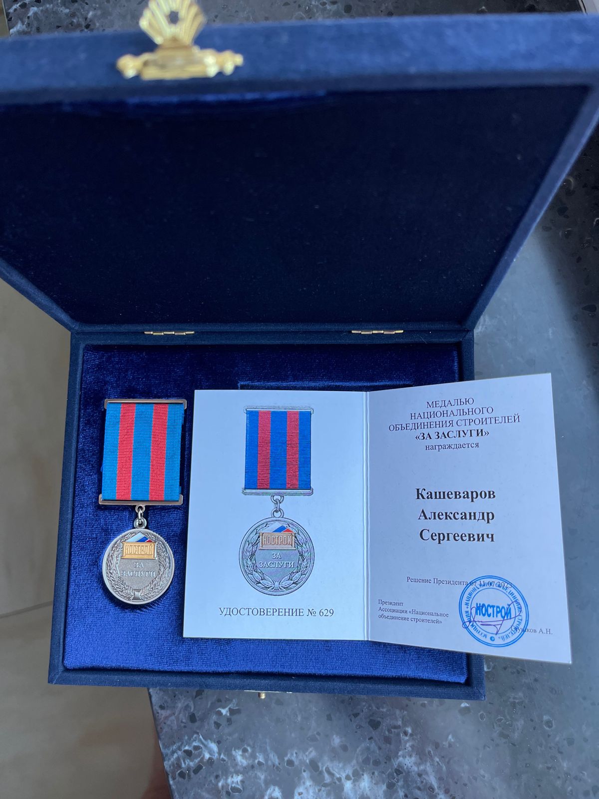 Также за многолетний вклад в развитие саморегулирования в строительстве Александр Кашеваров удостоен медали Национального объединения строителей (НОСТРОЙ) «За заслуги».